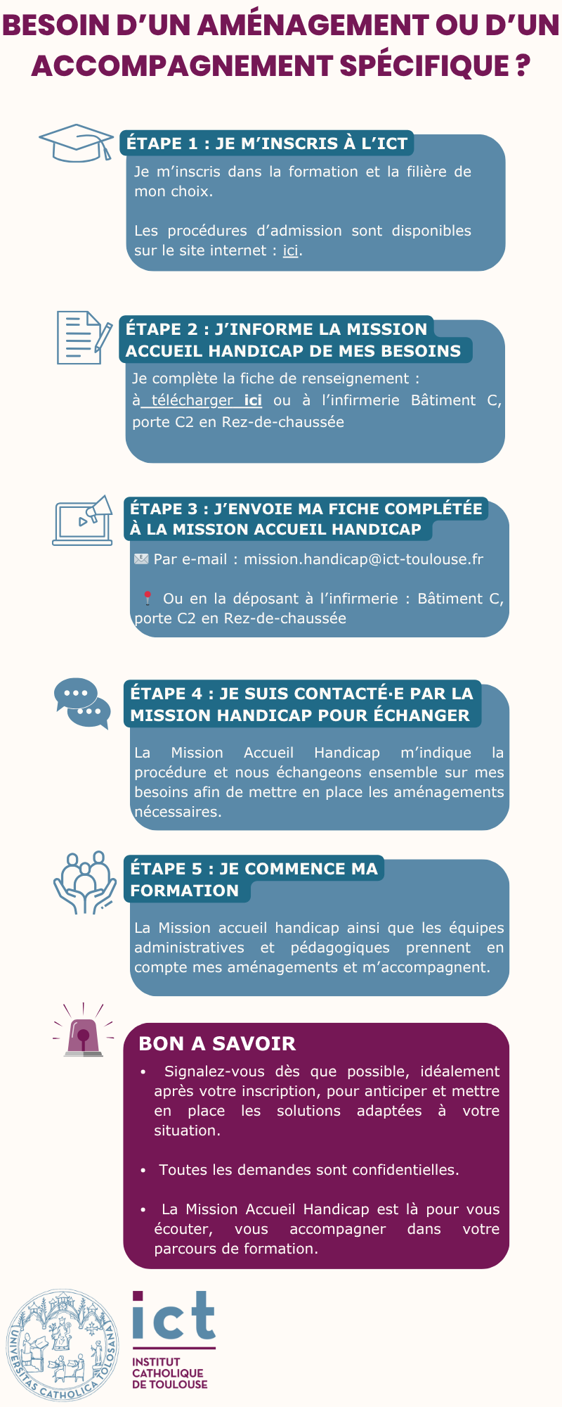 À l’Institut Catholique de Toulouse, nous nous engageons à offrir une expérience universitaire inclusive et accessible à tous nos apprenants, qu’ils soient en formation initiale ou professionnelle, et quelle que soit la nature de leur handicap ou de leur trouble de santé invalidant.